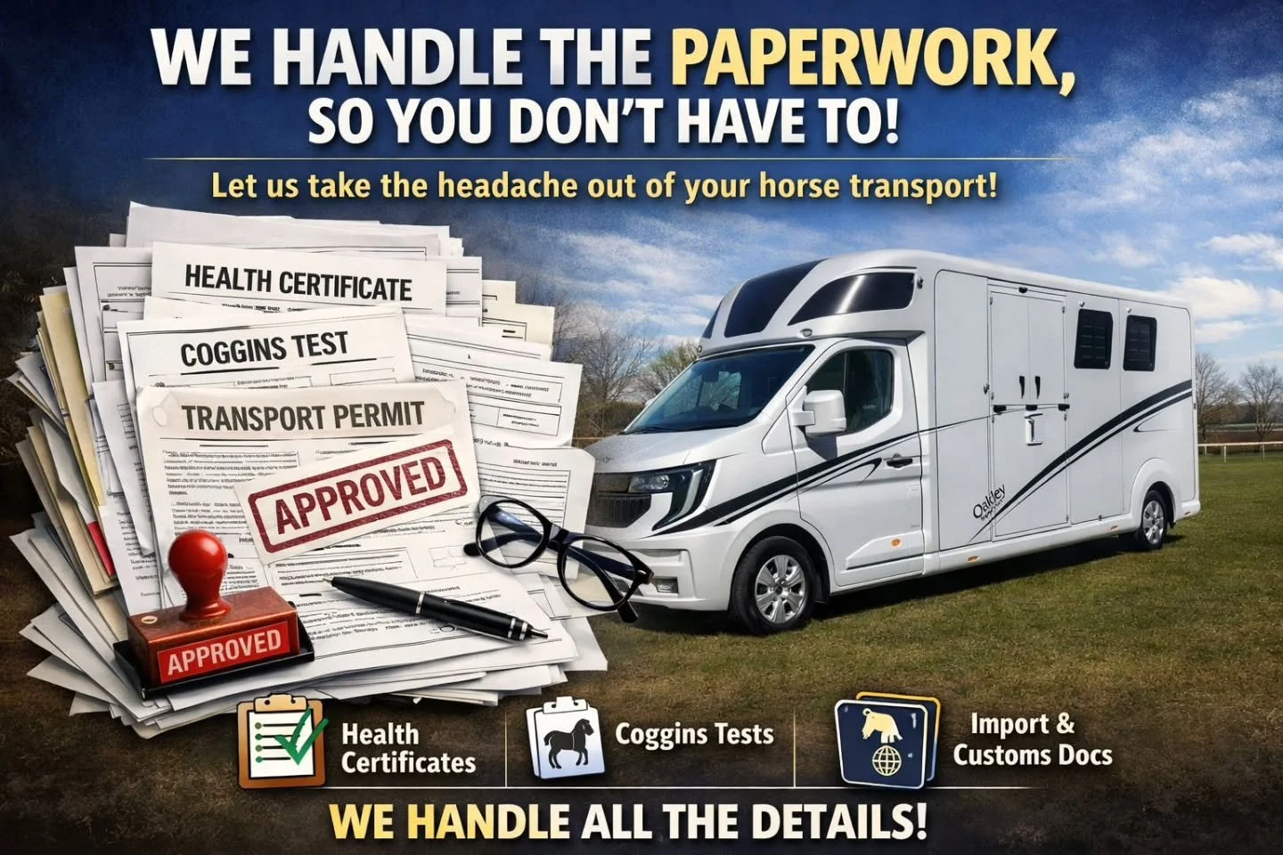 At Global Equine Transport (GET), we specialise in providing a hassle-free and efficient service tailored to the needs of equestrians. From handling all Export and Import documentation including DEFRA Paperwork to offering a comprehensive door-to-door service, we make the process simple and stress-free. You can count on GET to go the extra mile for you and your horse.